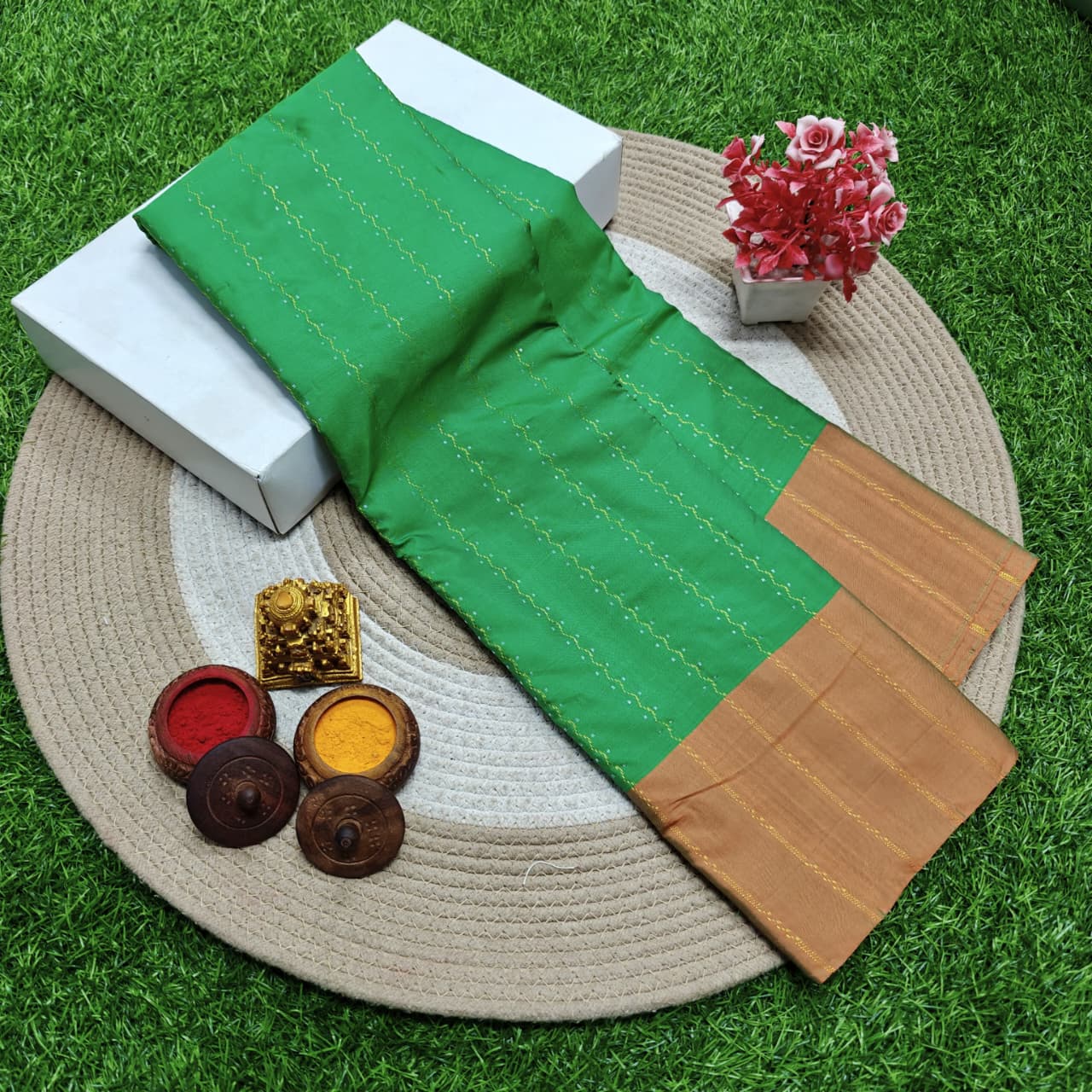 Be a vision in green! This stunning saree combines a refreshing green body with a rich, contrasting brown border. The subtle striped pattern adds a touch of modern elegance. Perfect for any occasion where you want to stand out.
