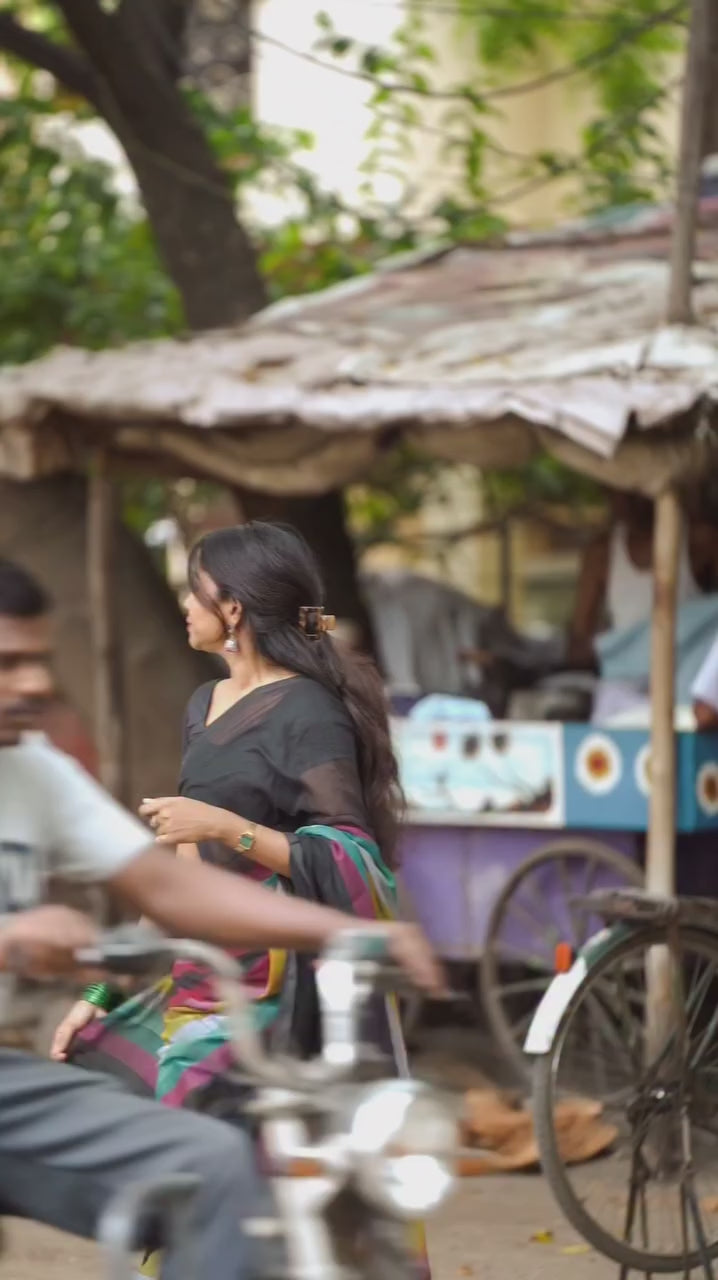 You're looking at a trendy Mul Mul Cotton Rainbow Saree! 🌈 Here are the details: